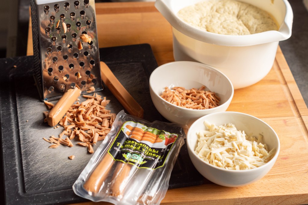 Anna taikinan kohota lämpimässä ja vedottomassa paikassa n. 30 minuuttia. Raasta sillä välin juusto ja nakit.