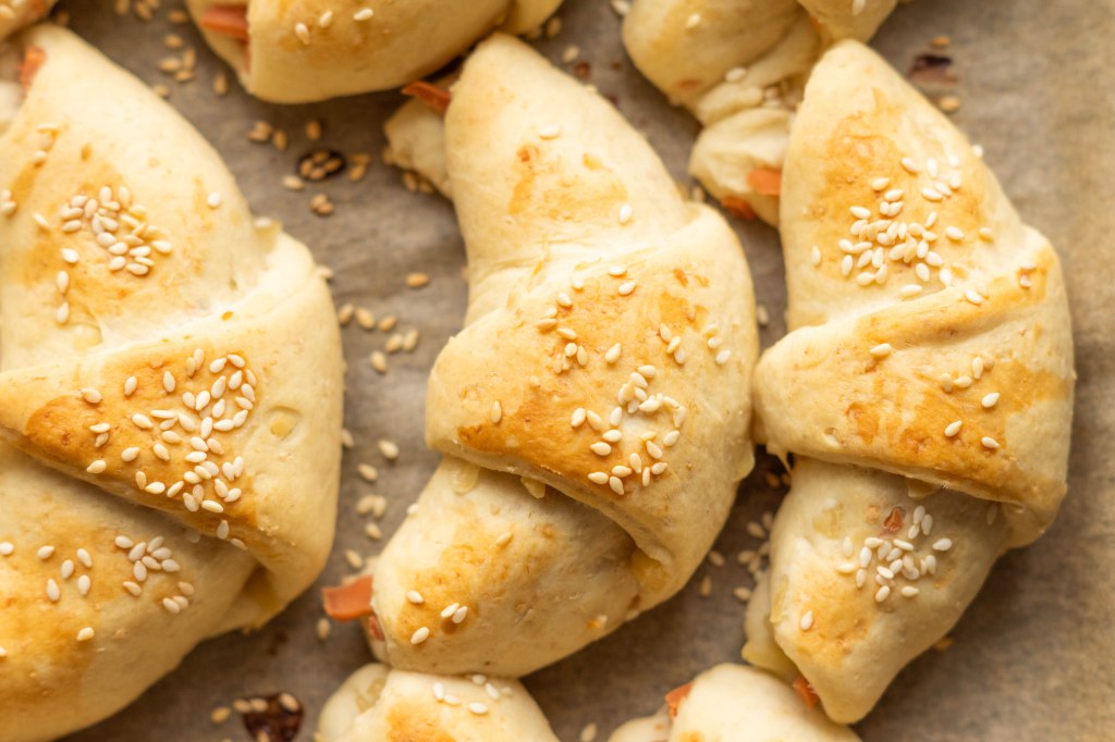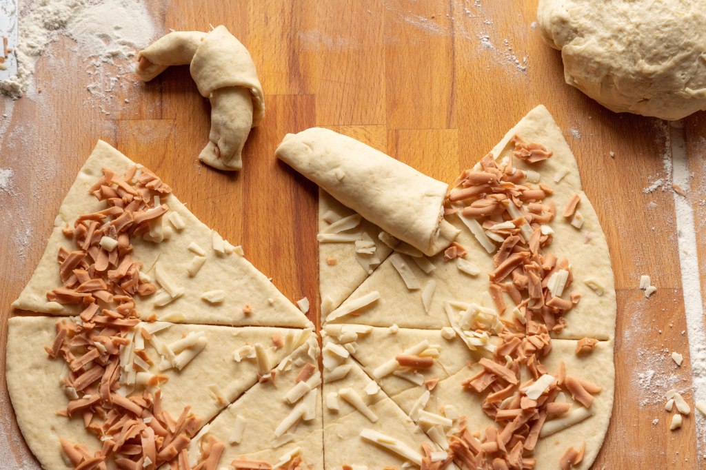 Taikina kannattaa kaulia ohueksi kuin pizzataikina, jotta sektoreihin jää kunnolla tilaa täytteille ja ne saa rullattua kunnolla sarven sisään. Anna sarvien kohota rauhassa vielä muotoilun jälkeenkin, niin saat unelmanpehmeitä herkkuja.