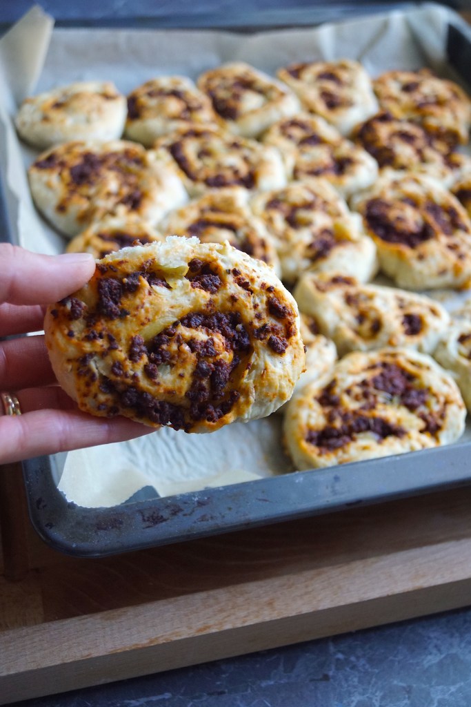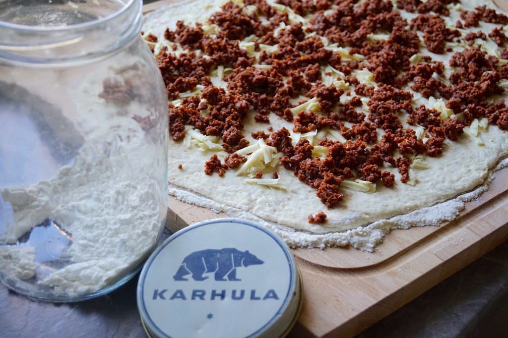 5.Aseta uunipellille reilu kaistale foliota ja sen päälle leivinpaperi. Muotoile taikina pötköksi leivinpaperin päälle. Käännä ensin leivinpaperin päät pötkön päälle ja rullaa pötkö kokonaan leivinpaperin sisään. Kääntele lopuksi folio koko komeuden päälle tiiviisti. Paista 1 h 15 minuuttia ja käännä pötkö aina 25 minuutin välein (eli kaksi kertaa paiston aikana). Paisti maistuu parhaalta miltei heti uunista tulleena. Leikkaa siivuiksi ja syö 3-4 päivän kuluessa. Paistia voi hyvin myös pakastaa.