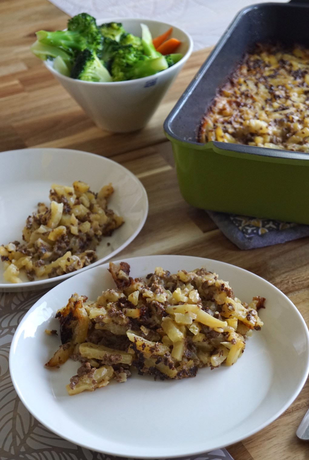 Kirjassa oli hyvin yksinkertanen soijarouhe-perunalaatikon ohje ja ajattelin heti, että tuota täytyy kokeilla. Suurensin ohjetta ja tein muitakin pieniä muutoksia. Kypsensin laatikon matalammalla lämmöllä ja huomattavasti kauemmin, mutta nyt neste oli suurustunut herkuliseksi ja vuoka tummunut päältä ja reunoilta juuri sopivasti. Lopputulos oli vielä parempi kuin mitä odotin. Tämä on edullinen, yksinkertainen, riittoisa ja ilmeinen hitti lasten keskuudessa. Oikea arkiruokien aatelia. Lämmin suositus! Vaihtelua saat kokeilemalla erilaisia maustettuja ruokakermoja tai lisäämällä mieluisia kasviksia joukkoon väriä tuomaan.