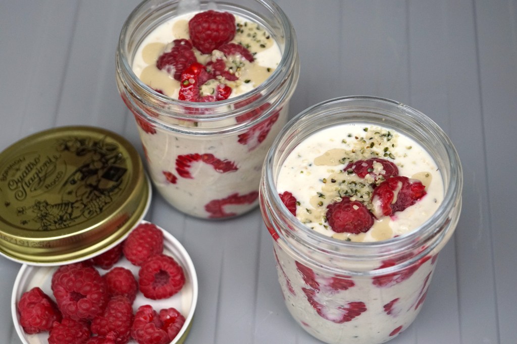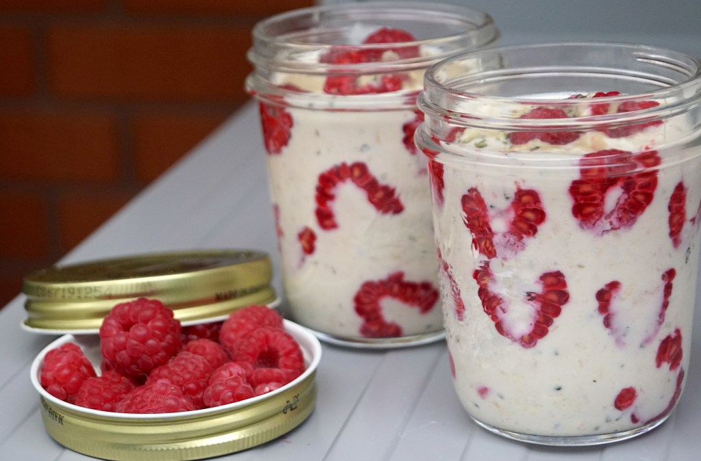 - Kaada seos ohuena nauhana täytteen joukkoon samalla koko-ajan vispaten. Sekoita vielä huolellisesti ja lisää lopuksi vadelmat täytteen joukkoon.